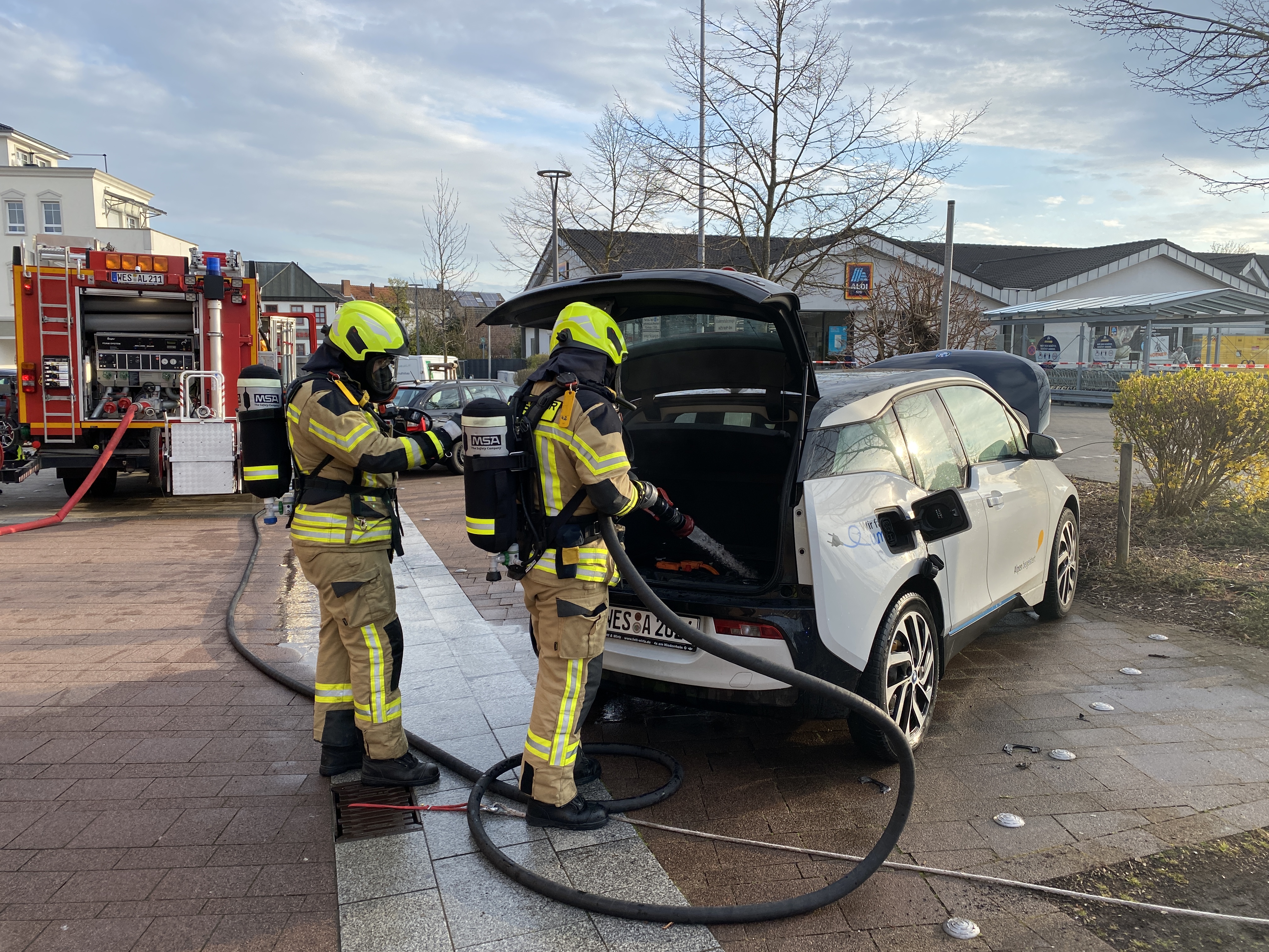 Zurück zu Alpen: Brennendes Elektrofahrzeug hält Feuerwehr in Atem