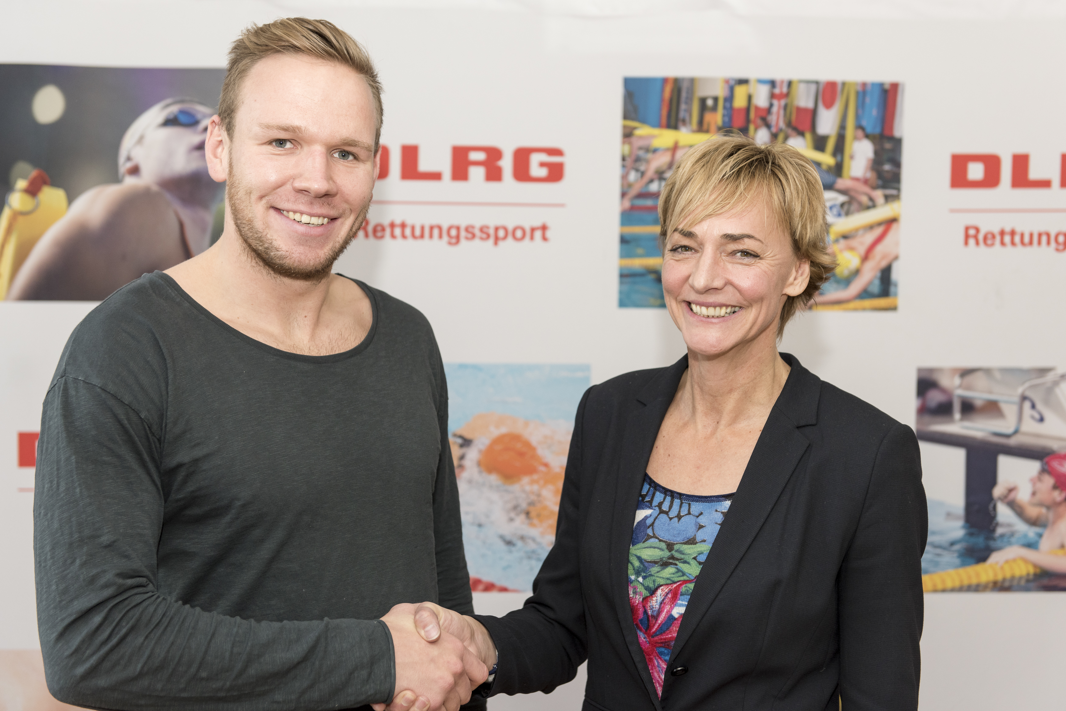Der amtierende Europameister im Rettungsschwimmen Kai-Uwe Schirmer nimmt stellvertretend für die Deutsche Lebens-Rettungs-Gesellschaft Gratulationen für den Weltrekord von der mehrfachen Olympiasiegerin Heike Drechsler entgegen. Bild: "obs/DLRG - Deutsche Lebens-Rettungs-Gesellschaft/Sascha Walther"