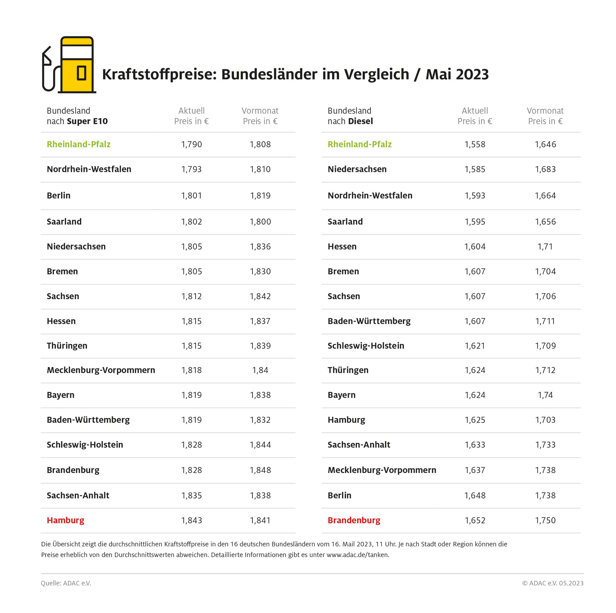 Kraftstoffpreise in den 16 deutschen Bundesländer am 16. Mai 2023, 11 Uhr