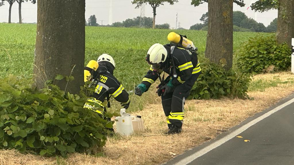 Zurück zu Bedburg-Hau: Gefahrgut-Einsatz: Chemikalien-Kanister an Landstraße entsorgt