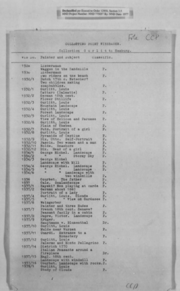 Münchener Kunstfund: Hildebrand Gurlitts Liste der 1945 beschlagnahmten Werke, Seite 1; Central Collecting Point Wiesbaden. Bild: National Archives Washington, screen shot - wikipedia.org