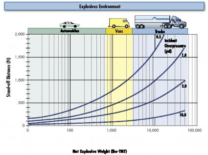Zerstörungskurven in Abhängigkeit von Entfernung zum Explosionszentrum und Sprengstoffmenge. Grafik: "obs/Aon Holding Deutschland GmbH"
