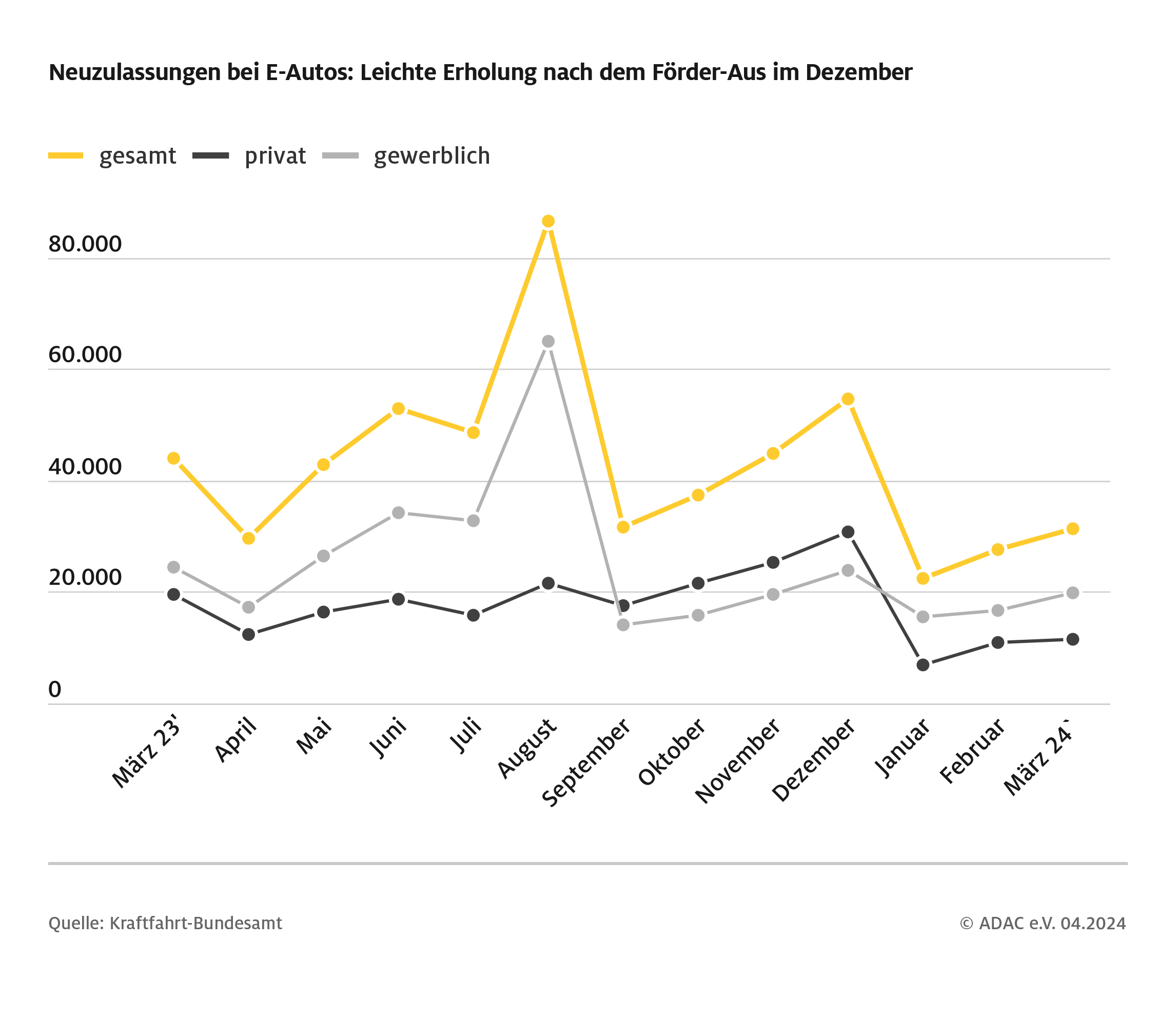 Privaten Neuzulassungen von E-Autos sind im Vergleich zum Jahresende 2023 stark eingebrochen.