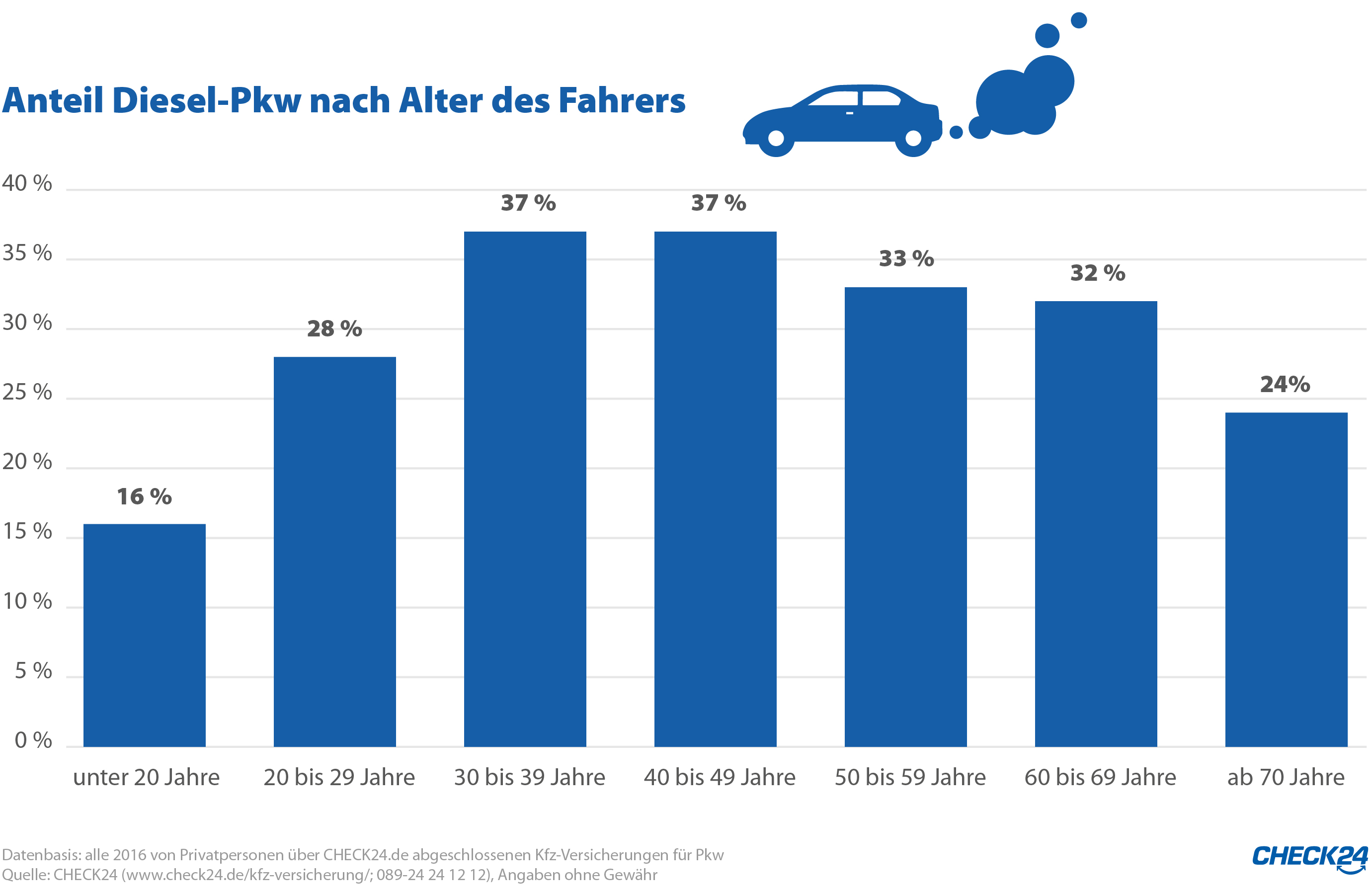 Bei Fahranfängern und Senioren ist der Anteil von Diesel-Pkw niedriger als in anderen Altersgruppen. Bild: "obs/CHECK24 Vergleichsportal GmbH"