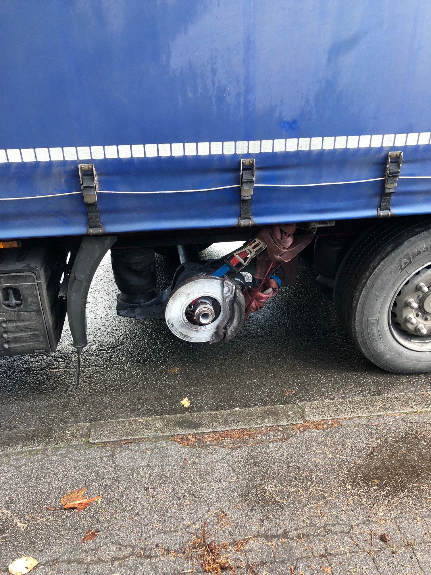 Zurück zu Dortmund: Fehlendes Rad samt Bremsscheibe + abgeklemmte Luftdruckleitungen + mit Spanngurten hochgebundene Achse = Stilllegung eines polnischen Sattelzugs