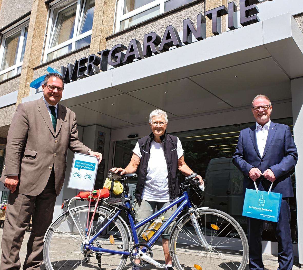 Patrick Döring (li., Wertgarantie-Vorstand) und Georg Düsener (re., Vertriebsleiter Bereich Fahrrad) freuen sich über den Besuch von Dr. Marta Binder. Bild: "obs/Wertgarantie/Wertgarantie | M. Höppner"