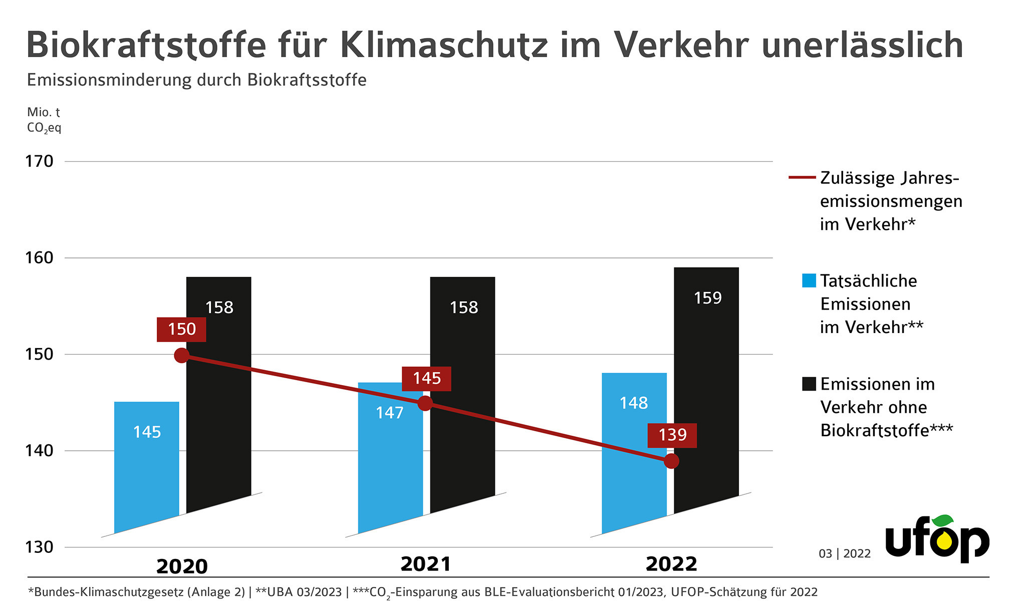 Die heute vom Umweltbundesamt (UBA) veröffentlichte Prognose zur Entwicklung der Treibhausgasemissionen bestätigt für den Verkehrssektor im Jahr 2022 eine Überschreitung von 9 Mio. t CO2eq. Ohne Biokraftstoffe wäre die im Bundesklimaschutzgesetz vorgegebene Emissionshöchstmenge um weitere 11 Mio. t CO2eq überschritten worden, stellt die Union zur Förderung von Oel- und Proteinpflanzen e. V. (UFOP) fest. Dies unterstreiche die Brückenfunktion von Biokraftstoffen aus nachhaltig zertifizierter Anbaubiomasse.