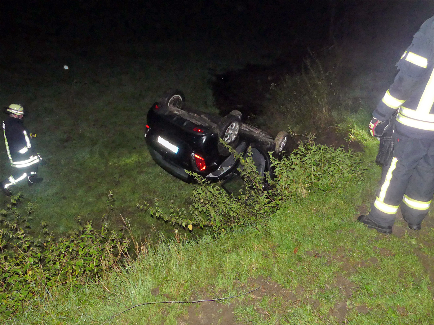 Der schwarze Kia landete auf dem Dach. Beide Insassen zogen sich leichte Verletzungen zu. Bild: Polizei