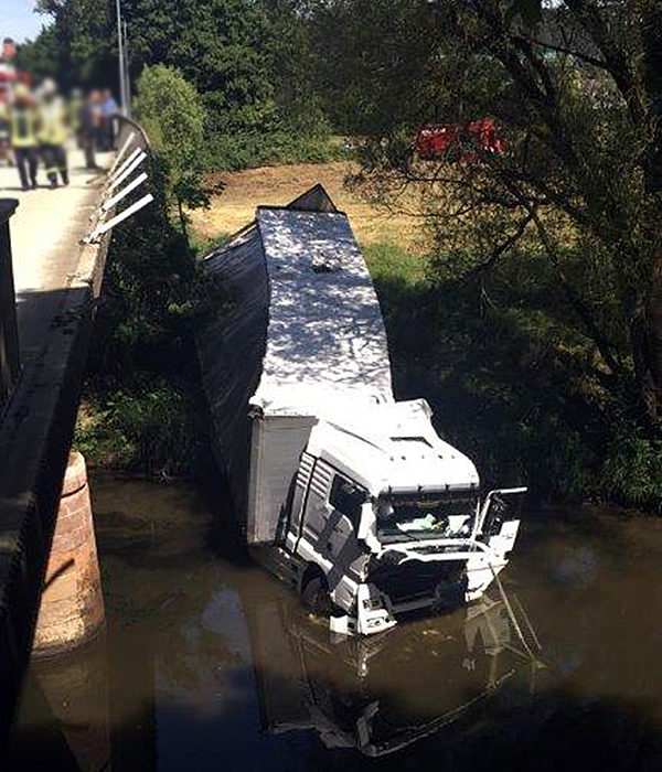 Zurück zu Marbug-Biedenkopf: Sattelzug durchbricht Brückengeländer und landet teilweise in der Lahn