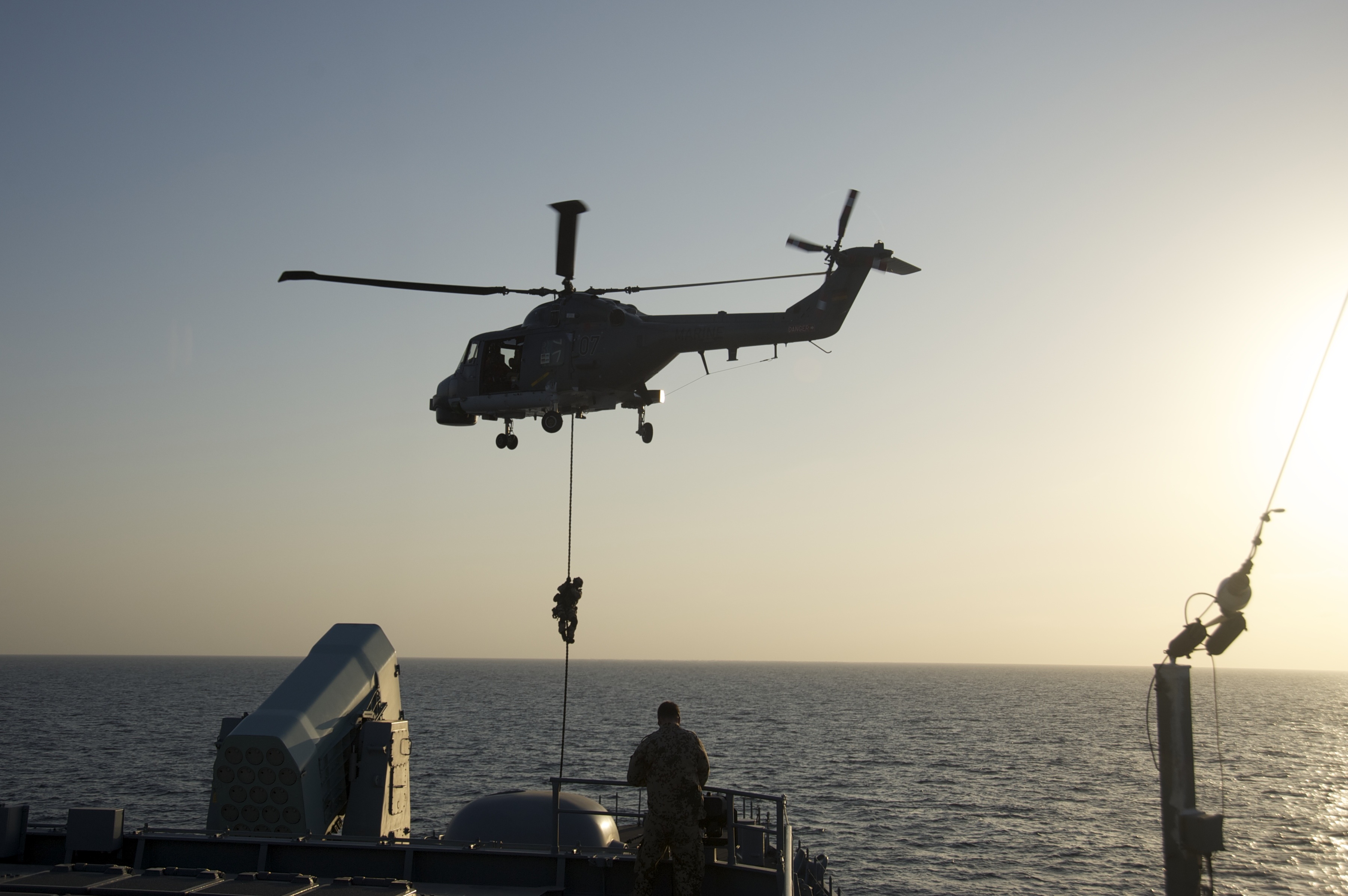 Fast Roping des Seebataillons aus Sea Lynx bei Übung mit Fregatte "Hessen". Bild. Bundeswehr / Jane Schmidt