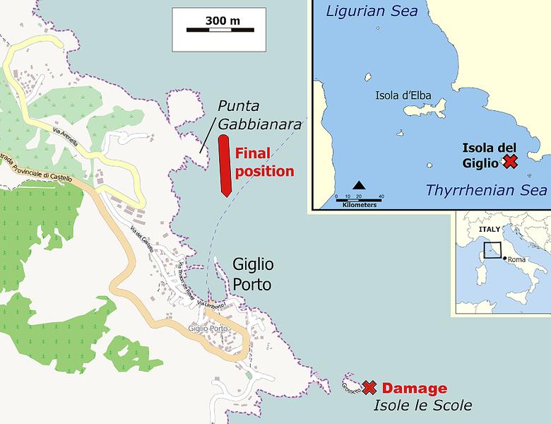 Kollisionsstelle (Kreuz rot, unten) und endgültige Position nach Wendemanöver (rot, Mitte) der Costa Concordia vor der Insel Giglio. Bild: J. J. Hornung / wikipedia.org