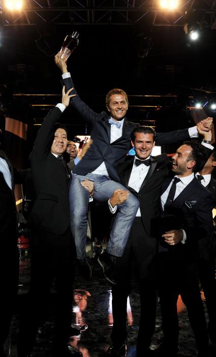Der spanische "World Class Bartender of the Year 2013" David Rios getragen von Manabu Ohtake, Erik Lorincz und Tim Philips (v.l.n.r.). (Photo David M. Benett/Getty Images for Diageo) *** Local Caption *** David Rios; Tim Philips; Erik Lorincz; Manabu Ohtake / Bild: "obs/Diageo Germany GmbH/David M. Benett/Getty Images for Diageo"