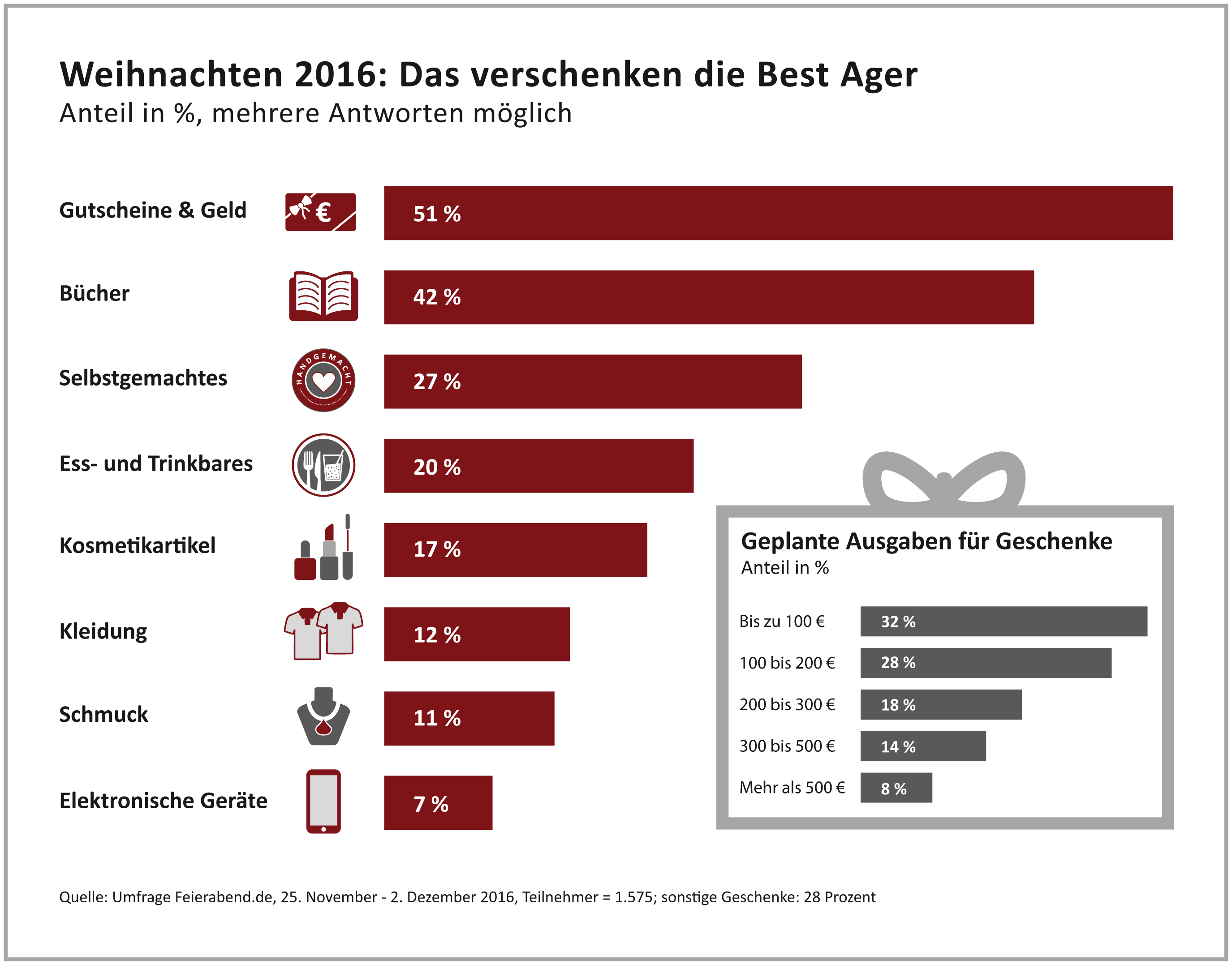 Zurück zu Weihnachtsgeschenke 2016: Die Top 5 der Senioren Gutscheine, Bücher und "Do it yourself" besonders beliebt