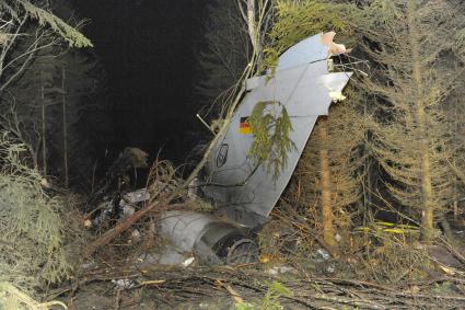 beschädigtes Kampfflugzeug vom Typ Tornado in einem Waldstück