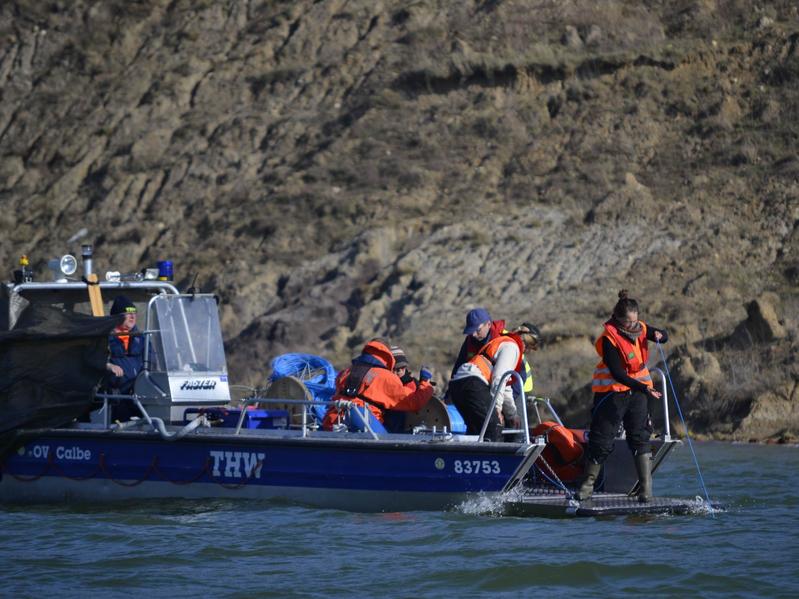 Forscher des Leibniz-Instituts für Gewässerökologie und Binnenfischerei (IGB) messen die Temperaturverteilung auf dem Grund des Concordia-Sees mit Unterstützung des Technischen Hilfswerks (THW) Quelle: Foto: IGB/Jörg Lewandowski (idw)