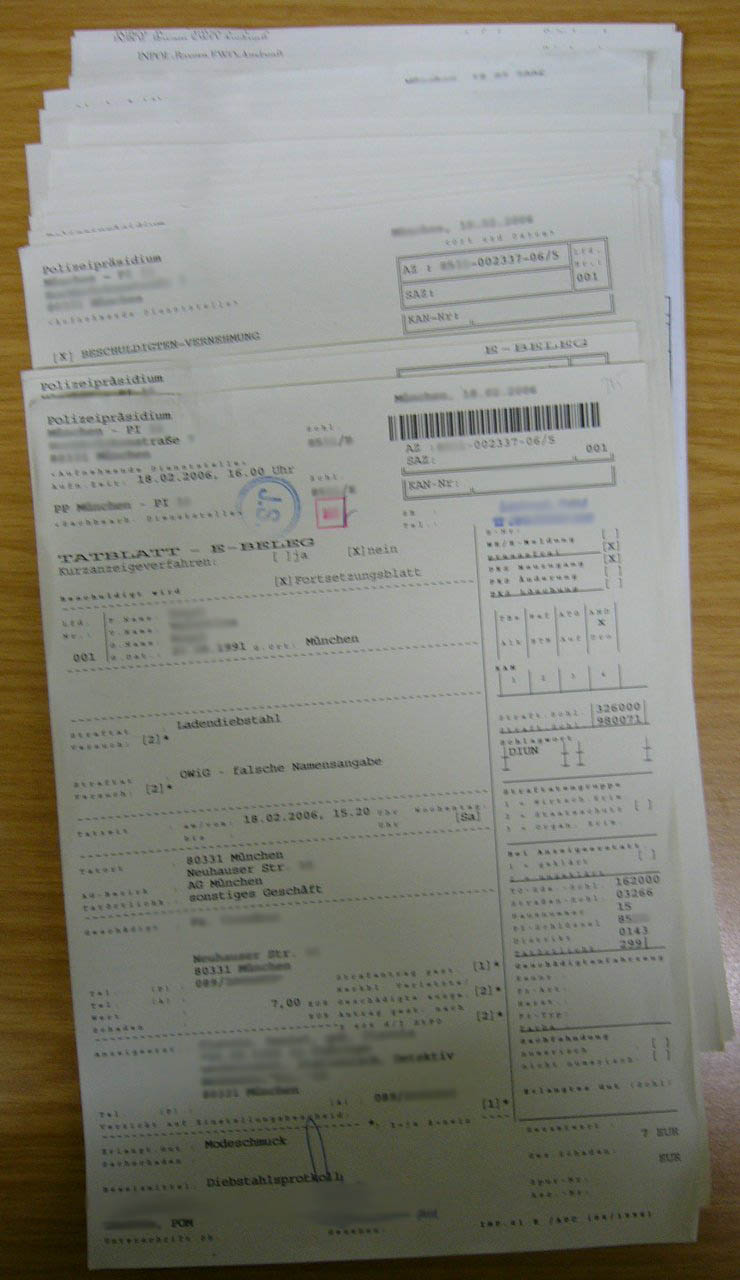 Tatblatt einer Strafanzeige in der Endsachbearbeitung der Polizei, noch ohne KAN-Nr. und Aktendeckel (Symbolbild)