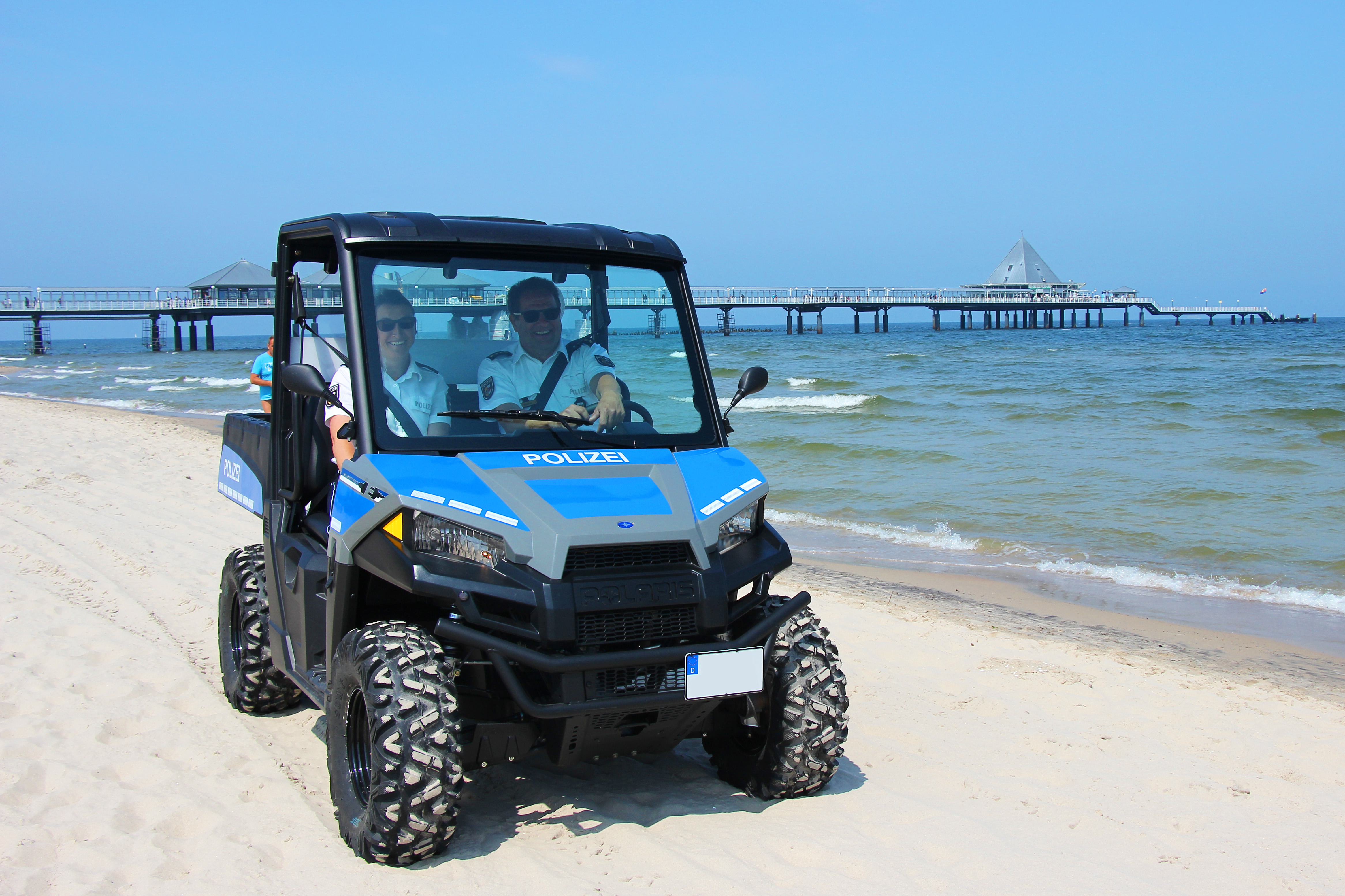 POKin Dörte Seidemann und LPD Gunnar Mächler bei der ersten Streifenfahrt am Strand von Heringsdorf.