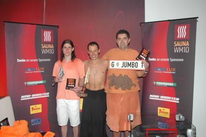Am Photo (von links nach rechts Benjamin Gauder aus Deutschland, Platz 2, Andreas Kofler aus Italien, Weltmeister, Platz 1 und Günther Hutter aus Österreich Platz 3. Bild: obs/Int. Verein zur Förderung der Sauna- und Wellnesskultur