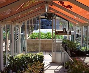 Treibhaus mit Photovoltaik-Folien auf dem Dach.