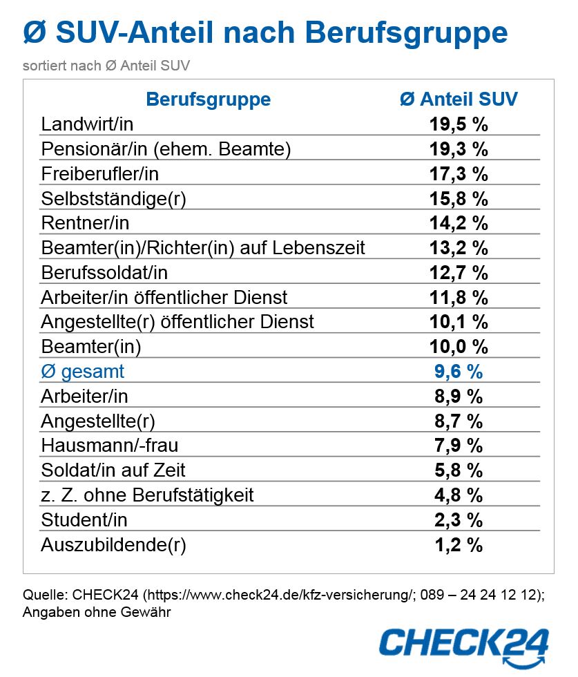 Durchschnittlicher SUV-Anteil nach Berufsgruppen |Bild: "obs/CHECK24 GmbH"