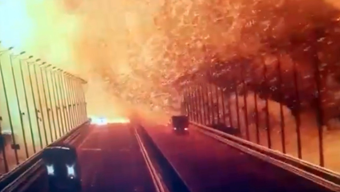 Ein Bild aus einem Überwachungsvideo zeigt Flammen und Rauch, die nach einer Explosion auf der Krim-Brücke in der Straße von Kertsch am 8. Oktober 2022 aufsteigen. Ein Lkw soll mit Sprengstoff beladen gewesen sein.