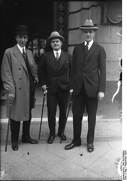 1929 wurde im Young-Plan die Dauer der Reparationszahlungen auf 59 Jahre (also bis 1988) festgesetzt. Insgesamt sollte Deutschland nach diesem Plan 112 Mrd. Goldmark bis 1988 zahlen. Das Bild zeigt Owen Young rechts und Dawes links. Bild: Bundesarchiv, Bild 102-00660A / unbekannt / CC-BY-SA