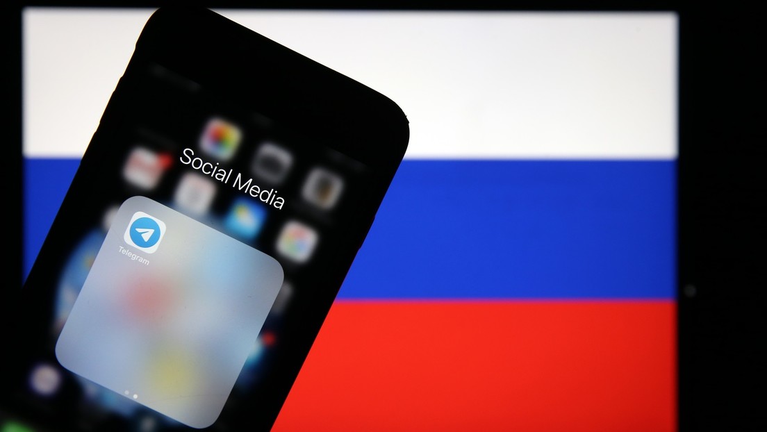 Das Logo von Telegram und die Flagge Russlands (Symbolbild). Bild: Rasit Aydogan/Anadolu Agency / Gettyimages.ru