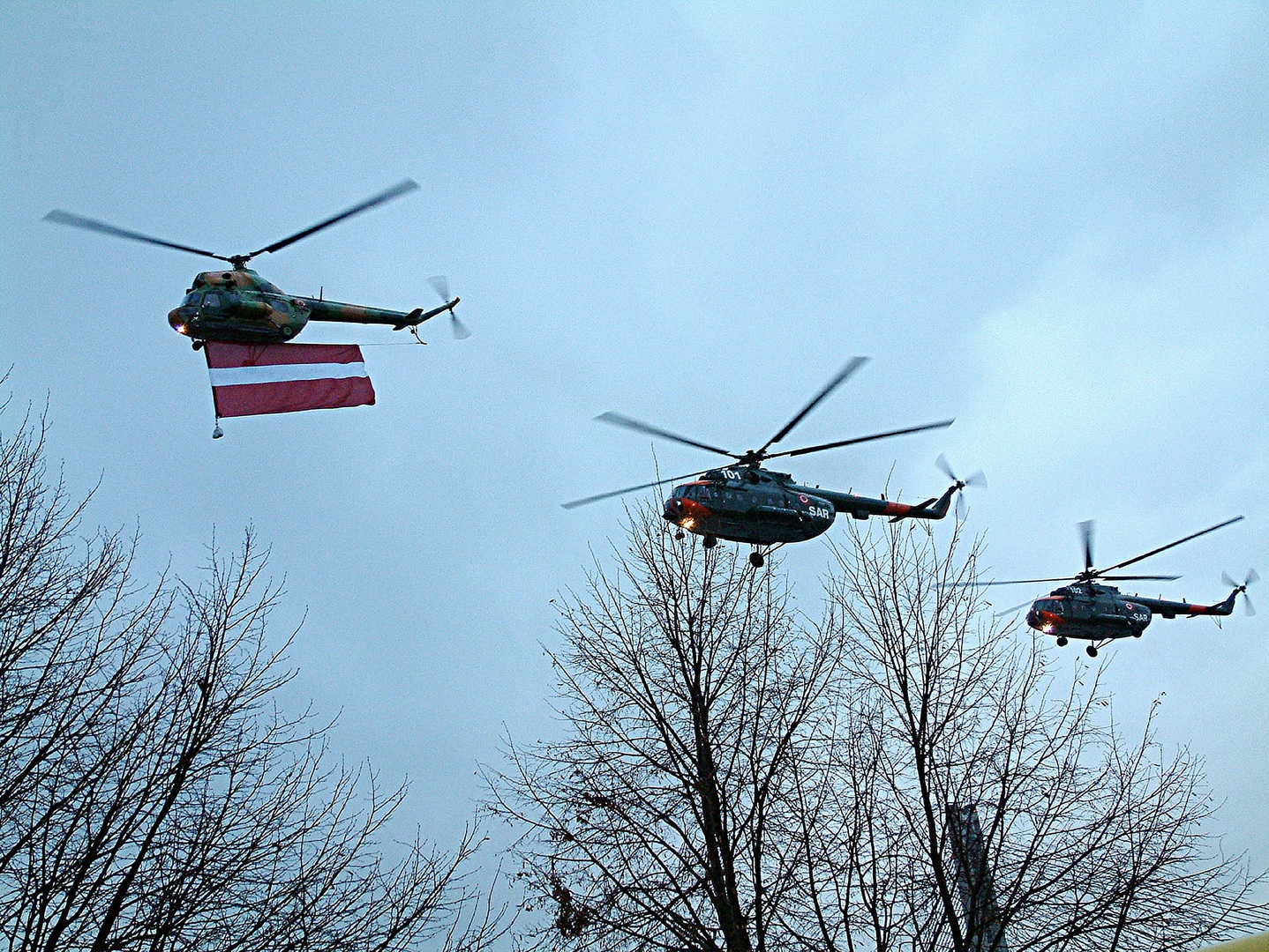 Lettische Hubschrauber - eine Mi-2 und zwei Mi-17 während einer Militärparade (Symbolbild). Bild: Victor Lisitsyn / www.globallookpress.com