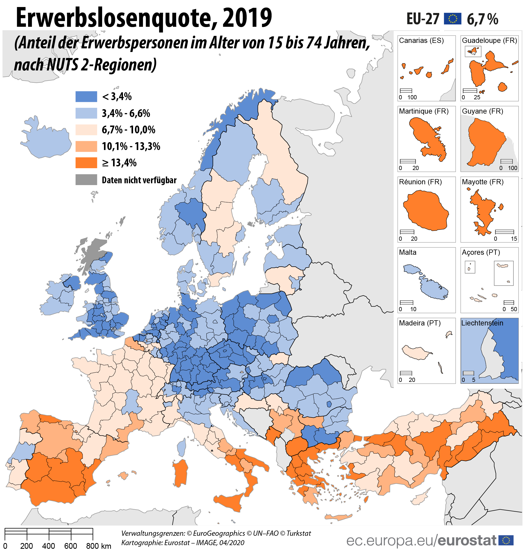 Erwerbslosenquote, 2019 (Anteil der Erwerbspersonen im Alter von 15 bis 74 Jahren, nach NUTS 2-Regionen) Bild: "obs/EUROSTAT"