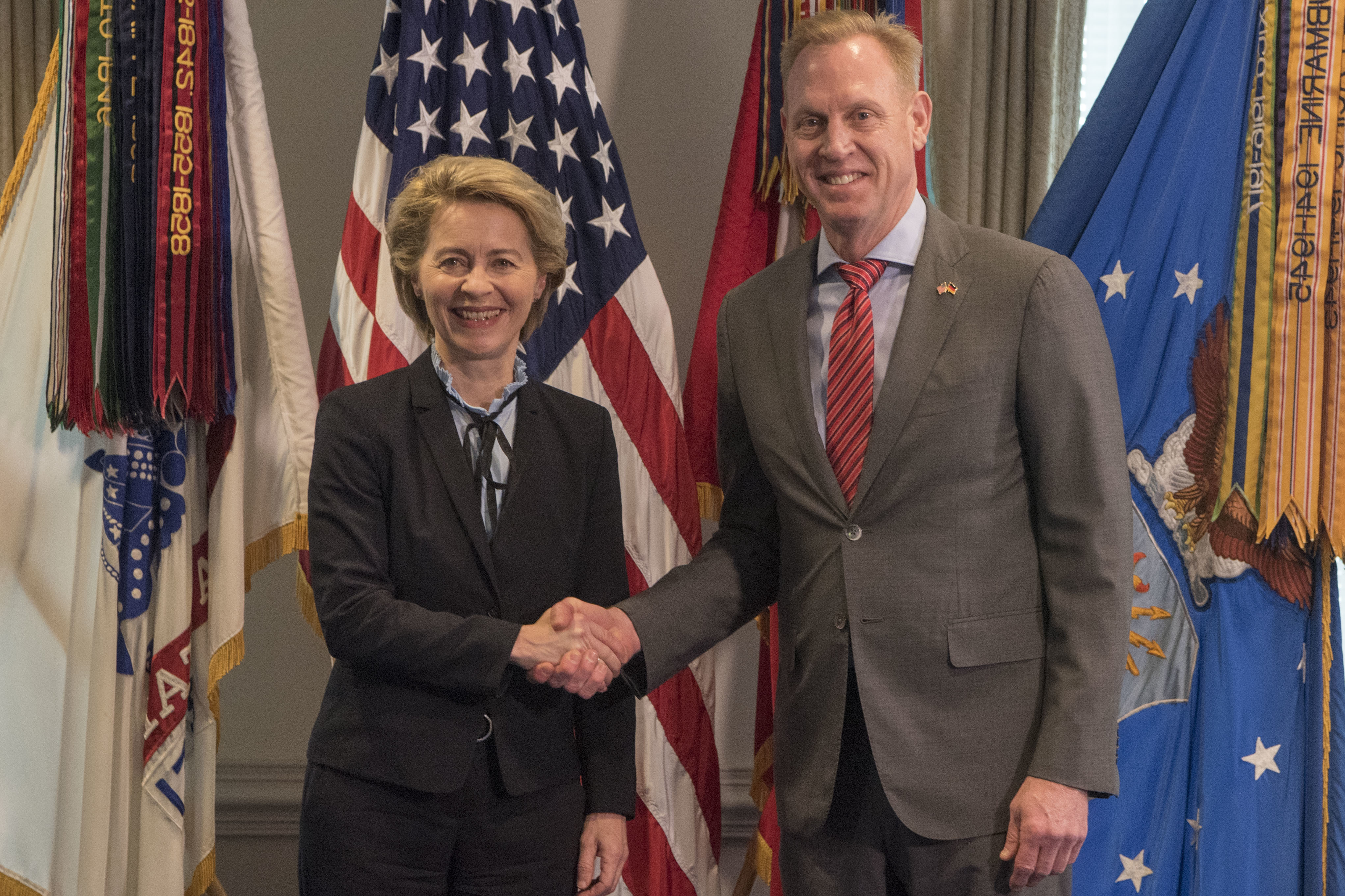 Ursula von der Leyen läßt sich mit der US-Amerikansichen Flagge repräsentieren. Der US-Secretär Patrick M. Shanahan trägt immerhin ein Emplem mit BRD-USA-Flaggenkombination (2019)