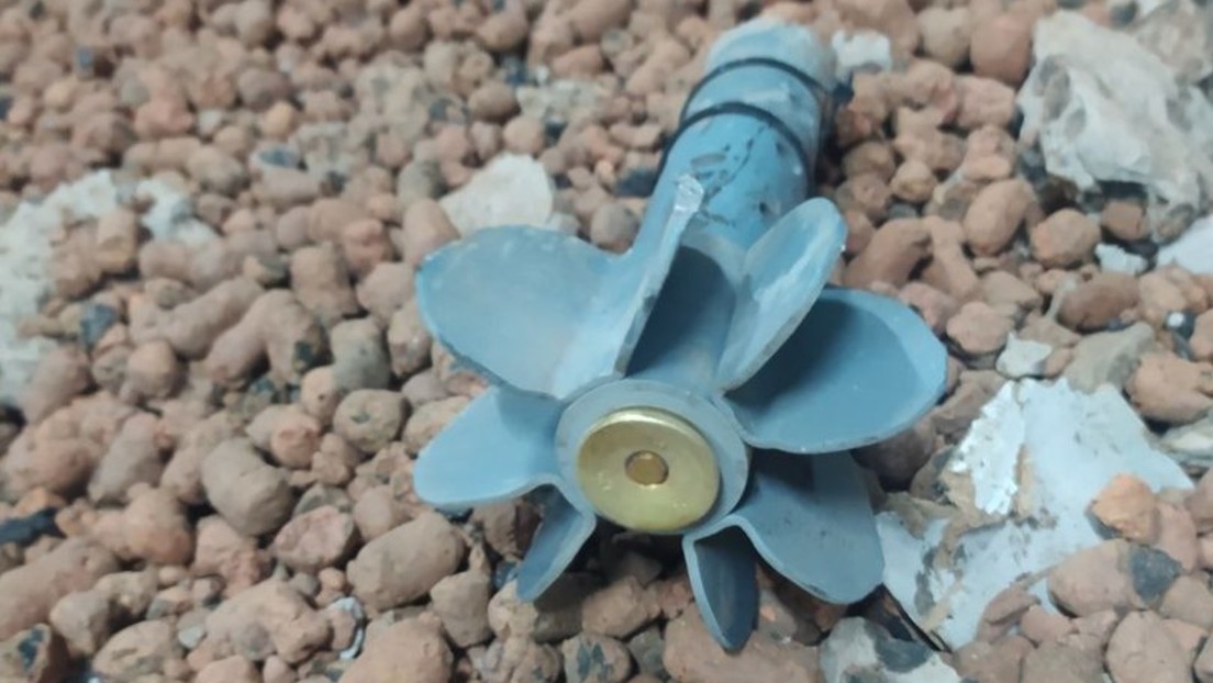 Leitwerkschaft (Fuß) einer als Freifallbombe bei einem Drohnenangriff der ukrainischen Streitkräfte auf ein Gebäude am AKW Saporoschje abgeworfenen Mörsergranate. 12. 07. 2022 Bild: Sputnik