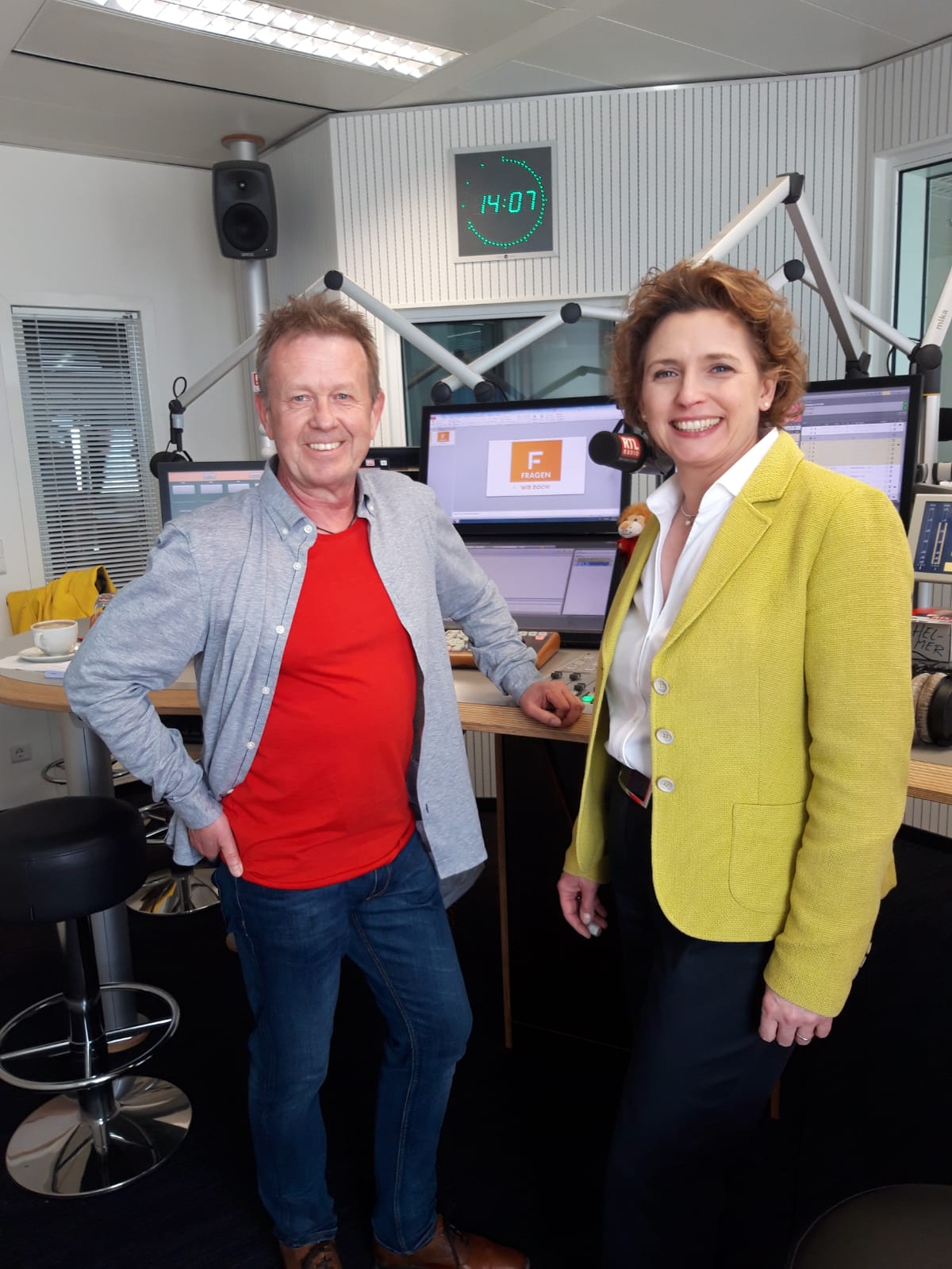 "FRAGEN WIR DOCH!"-Moderator Helmer Litzke mit FDP-Politikerin Nicola Beer im RTL Radio-Studio in Berlin. Bild: "obs/MAASS-GENAU - Das Medienbüro/Helmer Litzke, RTL Radio"