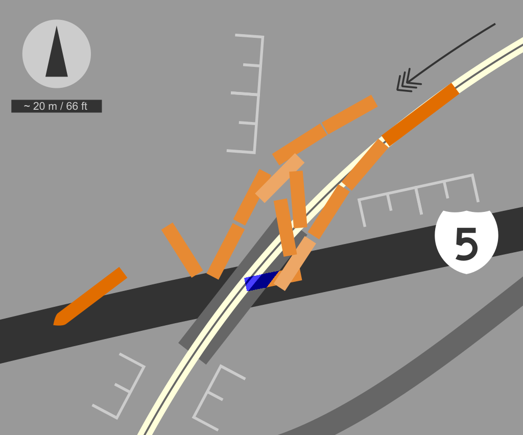 Darstellung der Unfallstelle. Die ziehende Lokomotive liegt ganz links im Bild auf der Richtungsfahrbahn Süd des Interstate 5. Das hinterste der 12 Fahrzeuge – die zweite Lokomotive am Zugschluss – ist (rechts-oben) als einziges Fahrzeug nicht entgleist. Ein Waggon (blau) liegt unter der Brücke. Pfeil = Fahrtrichtung des Zugs. E-Marken = Böschungen