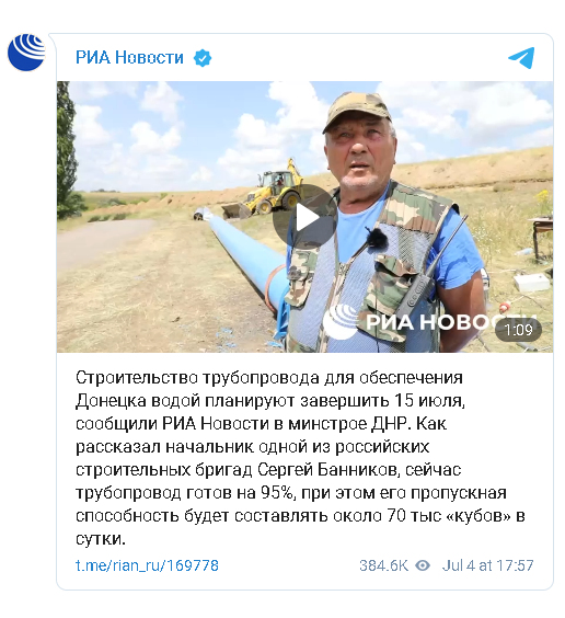 Zurück zu Wasserleitung zur Versorgung von Donezk soll Mitte Juli fertig sein