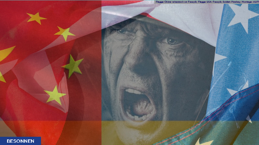 Bild: Flagge China: wirestock on Freepik; Flagge USA: Freepik; Soldat: Pixabay; Montage: AUF1 / Eigenes Werk