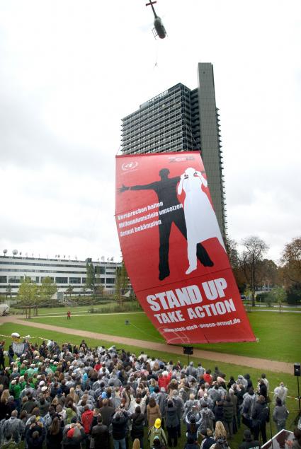 Auftakt für den Weltweiten Aktionstag "Stand Up" gegen Armut vor den Vereinten Nationen in Bonn: Weltweit fordern dieses Wochenende Millionen von Menschen die Umsetzung der UN-Millenniumsziele. Bild: obs/UN Millenniumkampagne in Deutschland