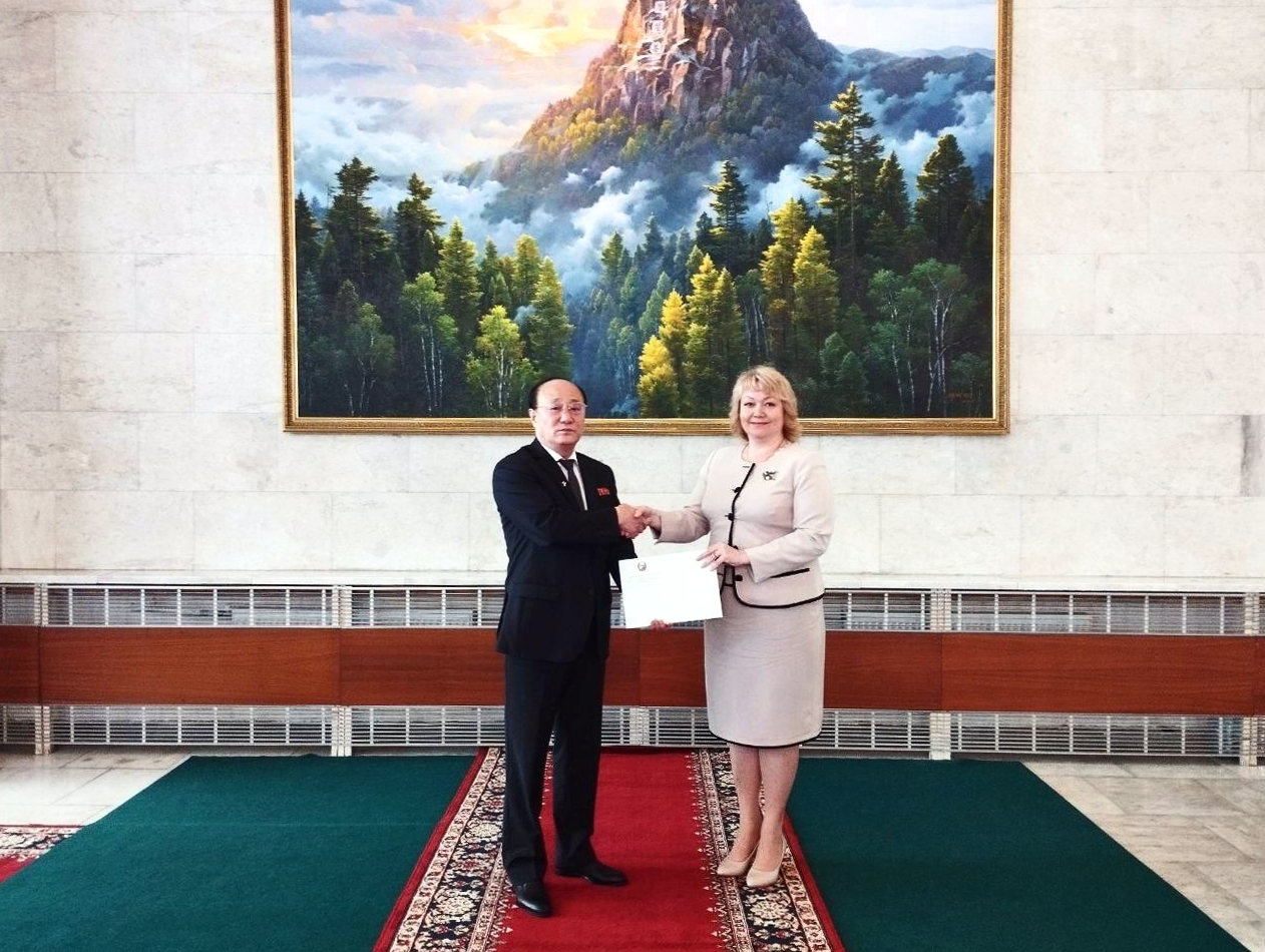 Nordkoreas Botschafter in Russland überreicht der Vertreterin von Donezk in Russland ein Dokument über die Anerkennung der DVR. Bild: Pressedienst der Botschaft der DVR / Sputnik