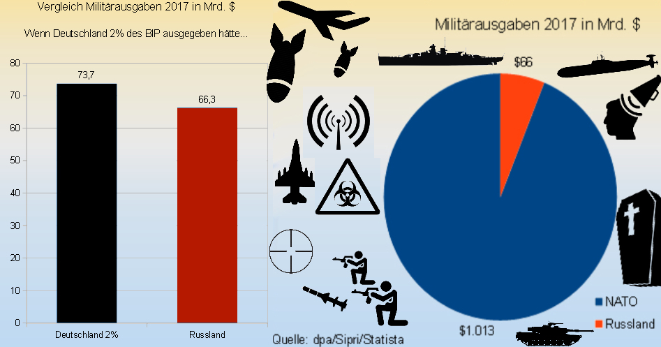 Militärausgaben im Vergleich, NATO gegen Russland / Hätte Deutschland 2% des BIP für Militär ausgegeben, so wären die Militärausgaben höher gewesen als die von ganz Russland. Die Zahlen basieren teils auf Schätzungen.