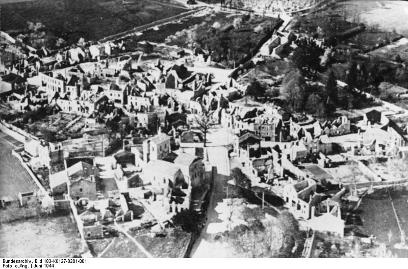 Luftaufnahme des zerstörten Ortes, Juni 1944
