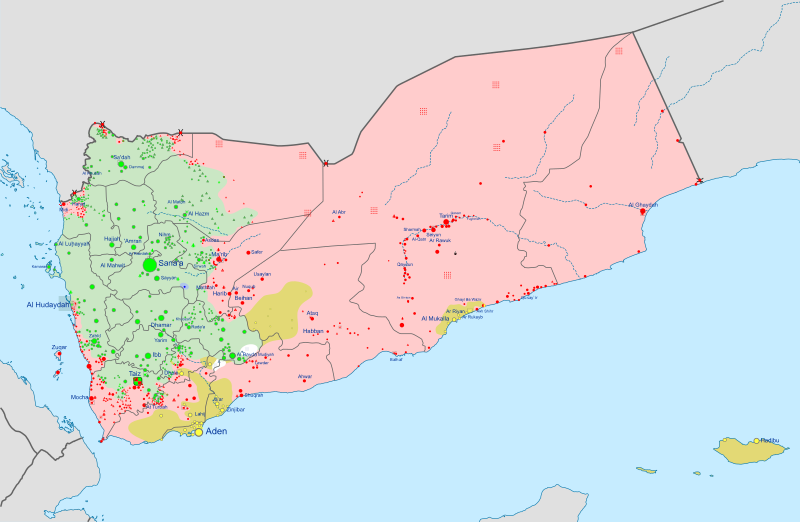 Von Huthi kontrollierte Gebiete im Jemen (hellgrün), Stand 2015