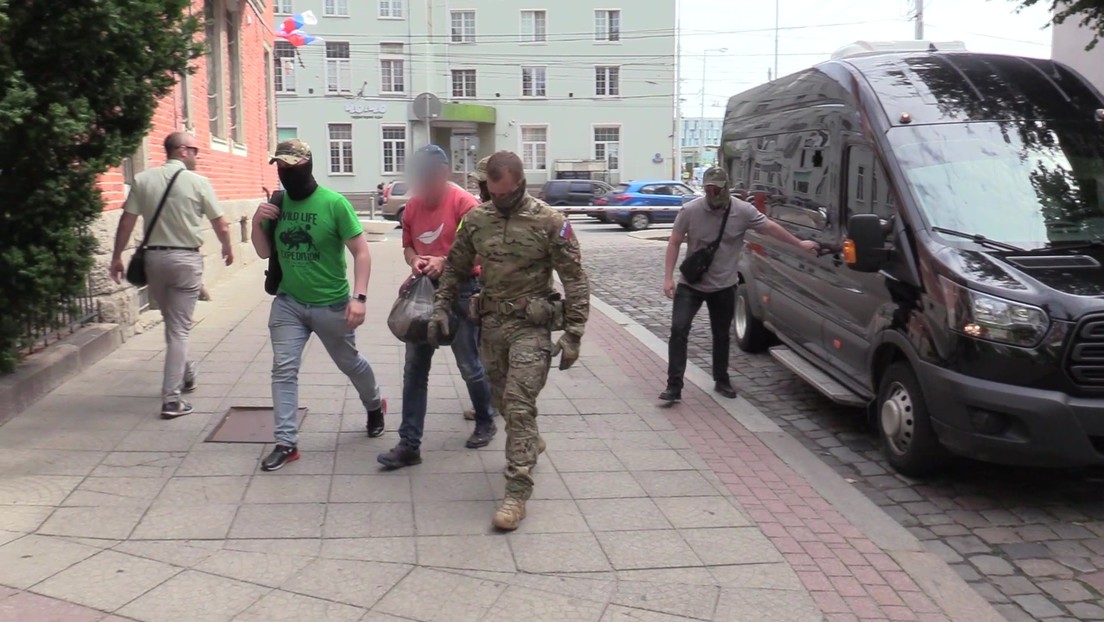 FSB-Mitarbeiter eskortieren einen Einwohner von Kaliningrad, der Terroranschläge geplant haben soll.