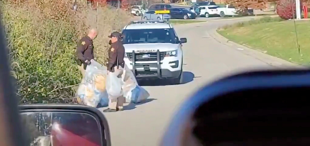 US-Polizisten sammeln am Straßenrand säckeweise weggeworfene Stimmzettel auf.