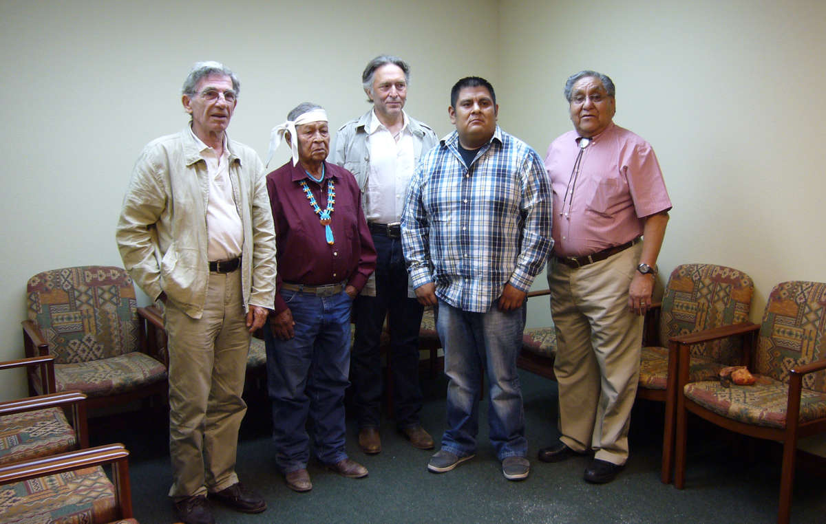 Anwalt Pierre Servan-Schreiber und Jean-Patrick Razon von Survival International übergaben die Katsina an den Vorsitzenden des Hopi-Rates und religiöse Anführer. Bild: © Survival