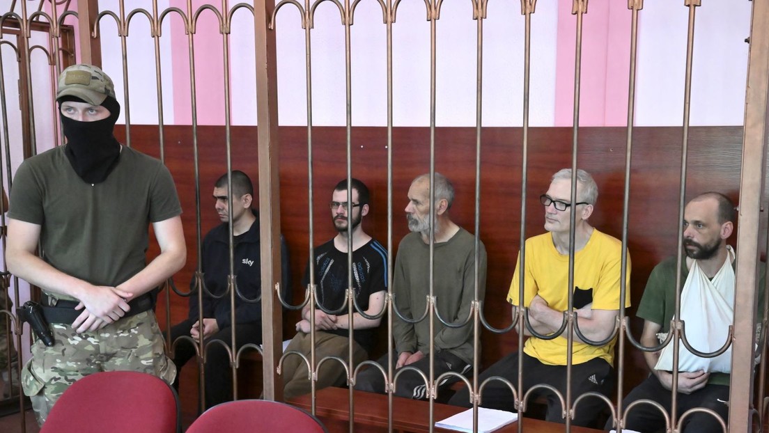 Von links: Die Angeklagten Vekoslav Prebeg, Dylan Healy, John Harding, Matthias Gustavsson und Andrew Hill, die angeklagt sind, als Söldner an Kampfhandlungen in der DVR im Rahmen ukrainischer bewaffneter Verbände teilgenommen zu haben, in einem Gerichtssaal in Donezk, 15. August 2022. Bild: Илья Питалев/РИА Новости / Sputnik