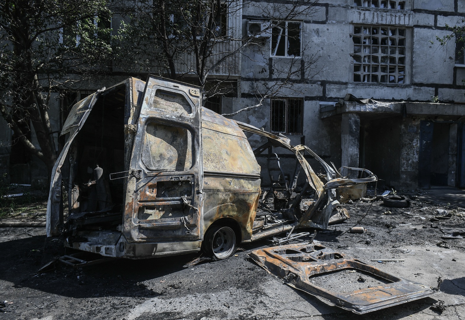 Ein nach Beschuss durch ukrainische Streitkräfte ausgebrannter Krankenwagen in Donezk Bild: KONSTANTIN MICHALTSCHEWSKI / Sputnik