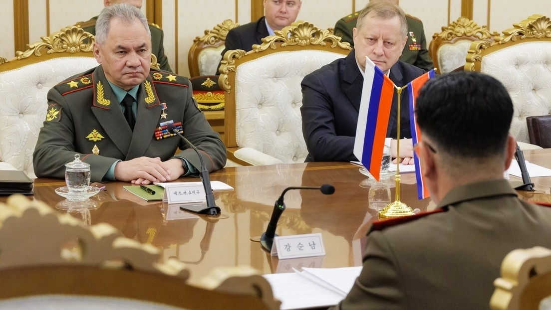 Archivbild: Der russische Verteidigungsminister, Armeegeneral Sergei Schoigu, während eines Gesprächs mit dem Leiter der Militärabteilung der Demokratischen Volksrepublik Korea, Armeegeneral Kang Sun-nam, in Pjöngjang Bild: Russisches Verteidigungsministerium / Sputnik