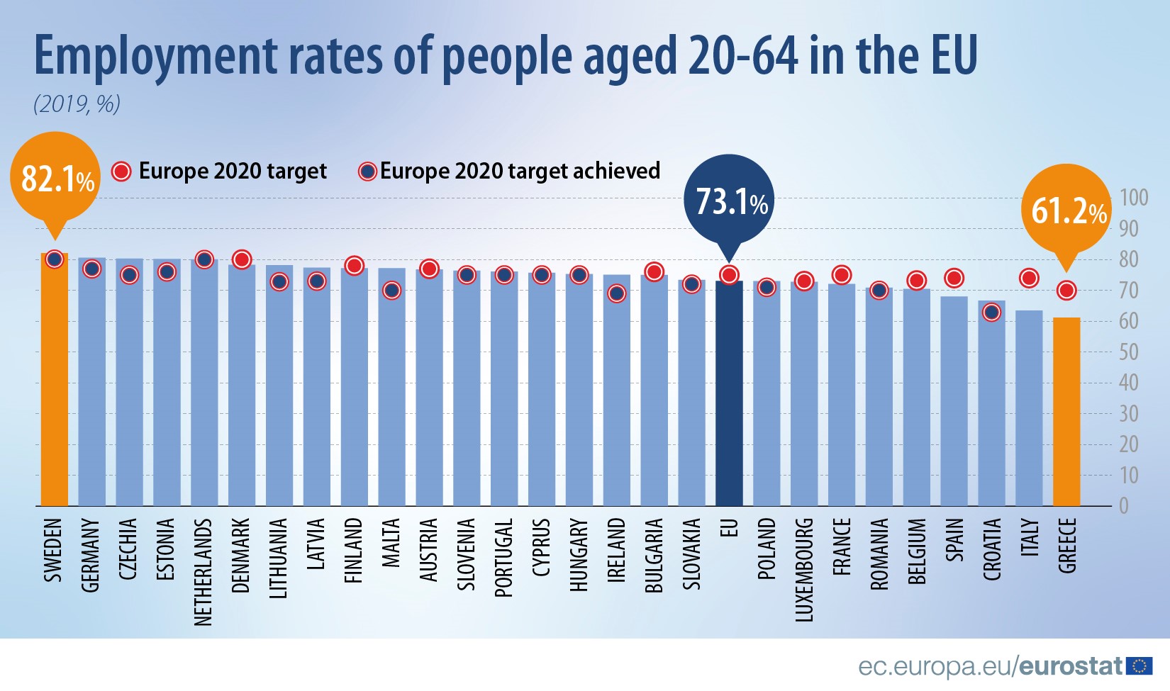 Erwerbstätigenquote der 20- bis 64-Jährigen in der EU (2019, in %) Bild: "obs/EUROSTAT"