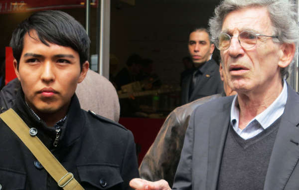 Hopi-Student Bo Lomahquahu und der Direktor von Survival International Frankreich protestierten im April 2013 gegen die Versteigerung von 70 Katsinam. Bild: Survival
