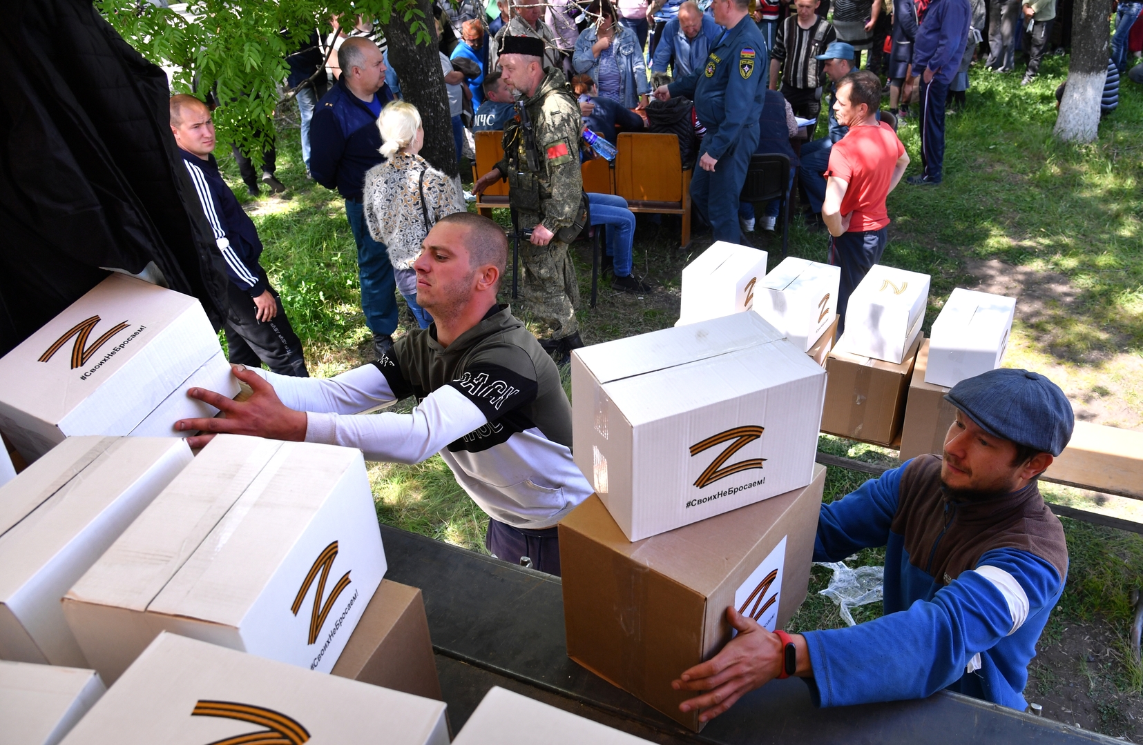 Auf dem Archivbild: Mitarbeiter des russischen Katastrophenschutzes entladen am 20. Mai 2022 einen Lkw mit Hilfsgütern für die Einwohner der Siedlung Jazkowka in der Volksrepublik Donezk. Bild: WIKTOR ANTONJUK / Sputnik