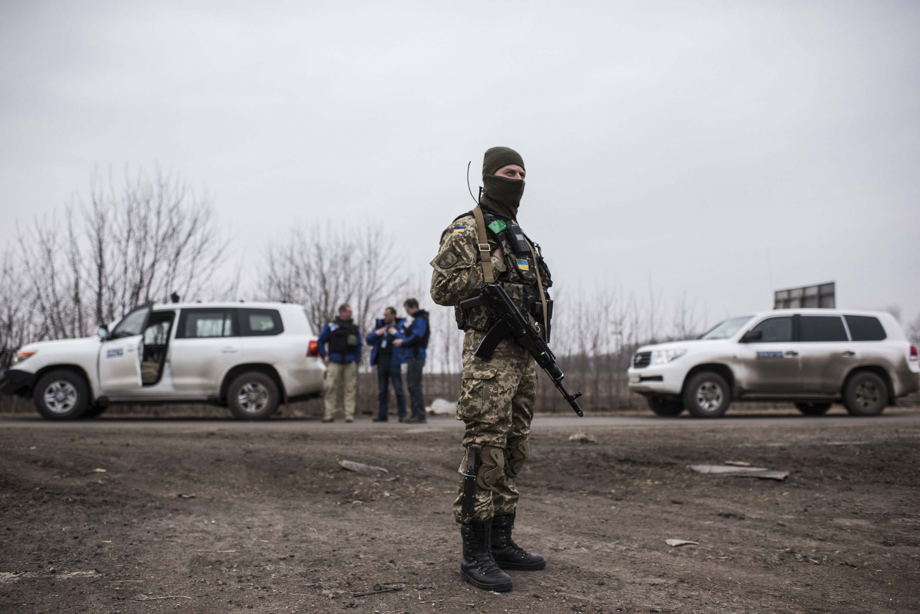 Beobachter der OSZE bei einer Stellung der ukrainischen Truppen im März 2015